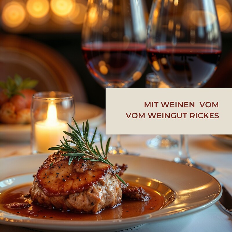 Unser 4-Gang-Menü wird von einer Weinprobe begleitet: Zu jedem Gang werden zwei passende Weine vom Weingut Rickes serviert – jenem Weingut, das auch unseren Hauswein liefert.