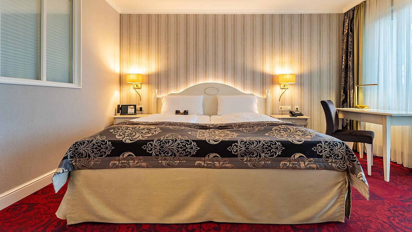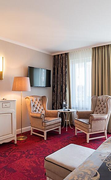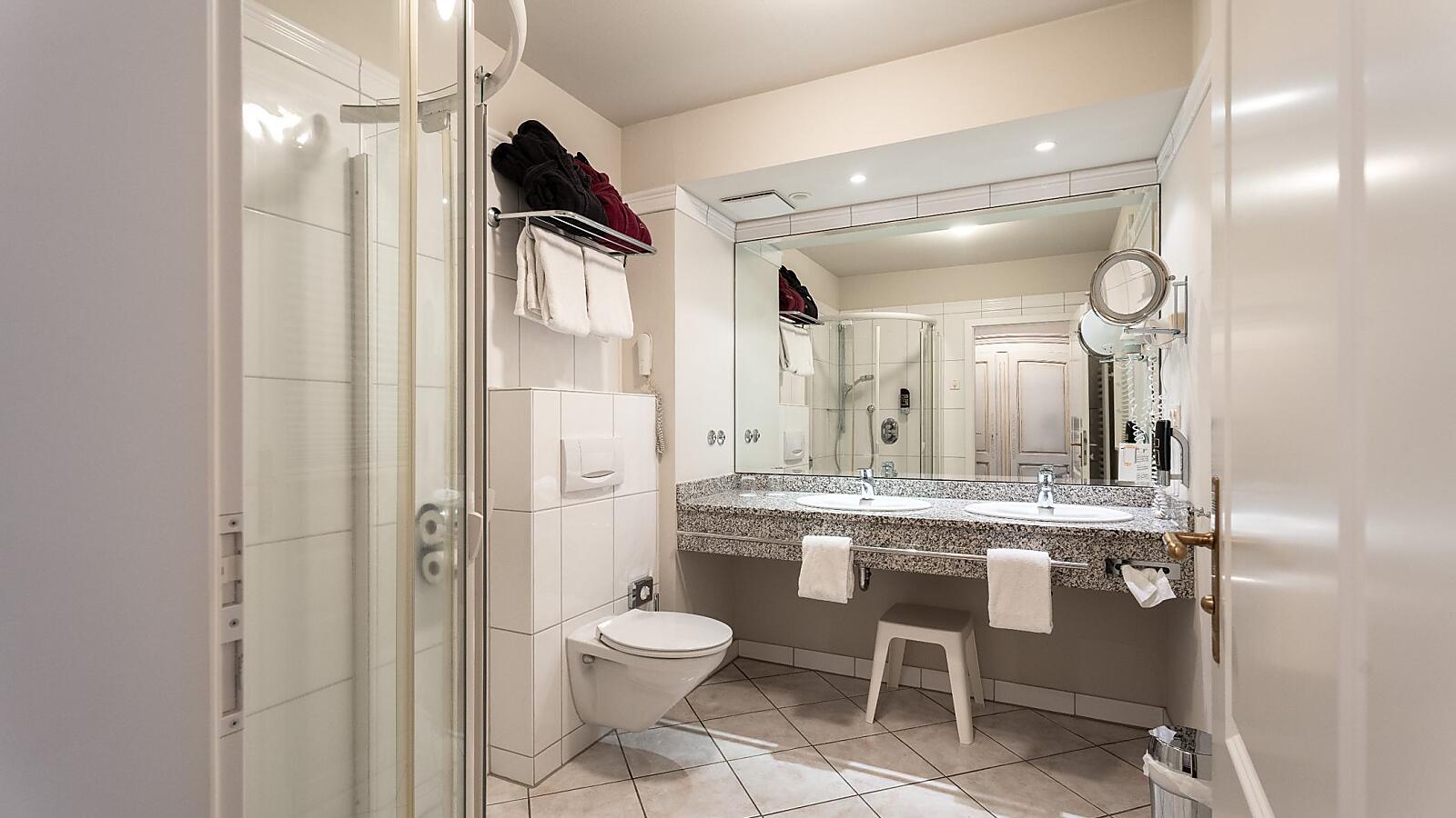 Das Zimmer verfügt über einen Balkon, ein Bad mit Dusche bzw. Badewanne (nach Verfügbarkeit), Haartrockner, Schminkspiegel, flauschigem Bademantel und Frottee-Schuhen sowie Fernseher, digitaler Gästemappe und Safe.