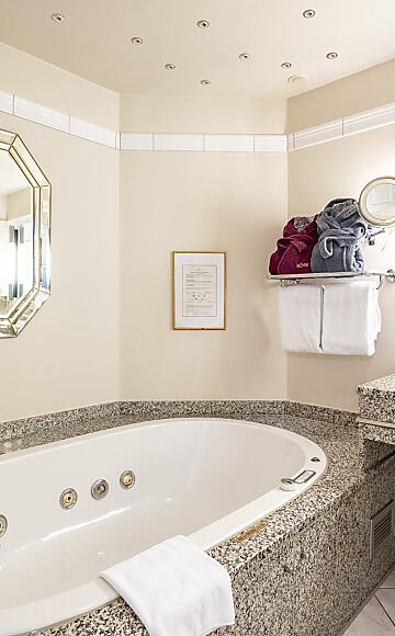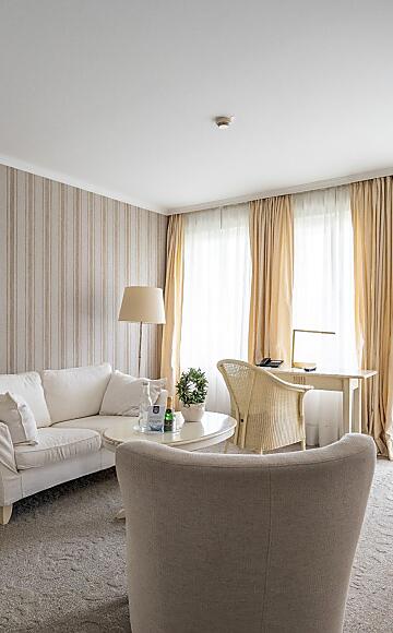 Das Zimmer verfügt über einen großzügigen Südbalkon, ein Bad mit Dusche und Badewanne, Himmelbett oder Baldachin, separates Wohnzimmer, Haartrockner, Schminkspiegel, flauschigem Bademantel und Frottee-Schuhen sowie Fernseher, digitaler Gästemappe und Safe.